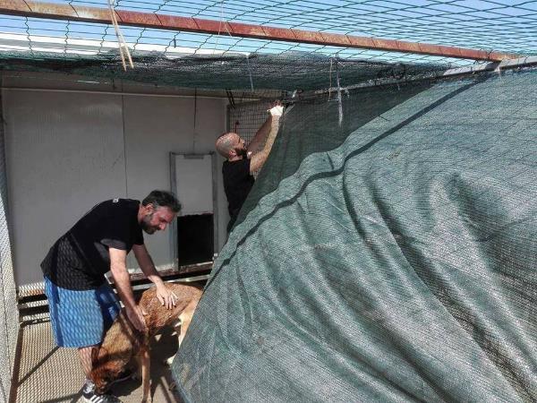 A seconda delle stagioni, ci occupiamo di mitigare il caldo torrido dei raggi solari o il freddo pungente dell'aria gelida. Da fine Maggio a fine Settembre provvediamo alla creazione di zone d'ombra su tutte le zone giorno delle gabbie e quindi posizioniamo su tutte le gabbie, sui corridoi antistanti ad esse e in alcune aree degli sgambi metri e metri di ombreggine, che schermano i raggi solari e creano zone d'ombra che permettono che i cani stiano il più possibile al riparo dalla pericolosa calura a cui sarebbero altrimenti troppo esposti.