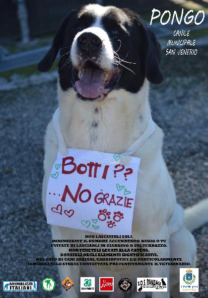 Questa campagna contro i botti realizzata a Dicembre 2016 è stata una proficua collaborazione tra le associazioni Animalisti Italiani, Associazione Beta, Lega anti vivisezione, Lav, Legambiente, Lipu, Sos Randagi, L’Impronta Volontari Indipendenti Canile ed il Comune di La Spezia.